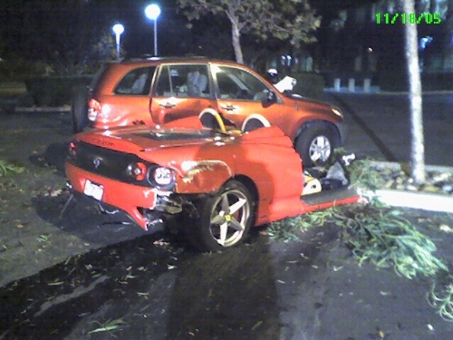 Crashed into a pole at high speed resulting in the car splitting in half.